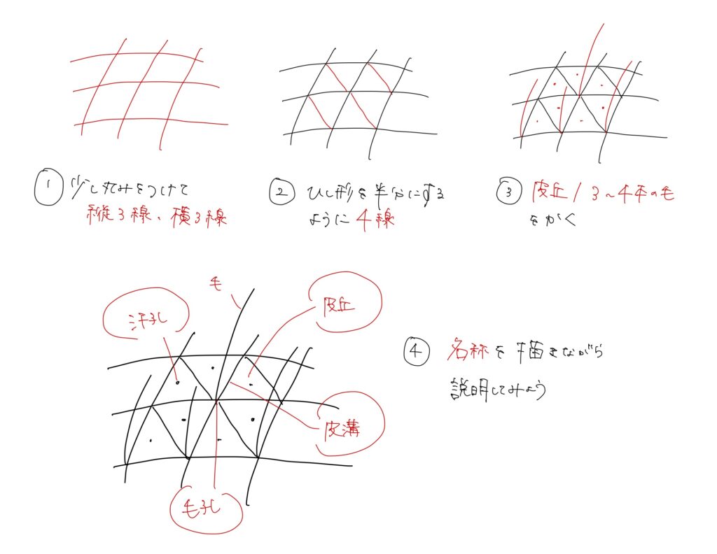 ということで、「実践講座」として、肌表面の知識を思い出しながら構造を描いてみましょう。