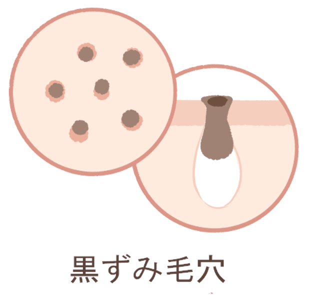過剰な皮脂と古い角質が混ざって角栓となり、毛穴に詰まることが原因です。酸化すると黒くなります。汗や皮脂の他に、メイクが洗いきれずに残っている(油の汚れ)ことでも起こります。